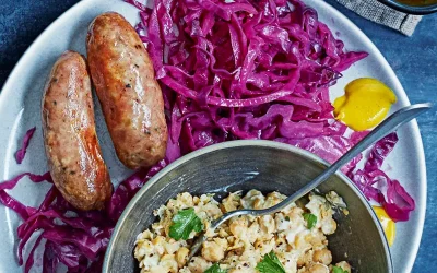 Sausages with chickpea mash & braised red cabbage